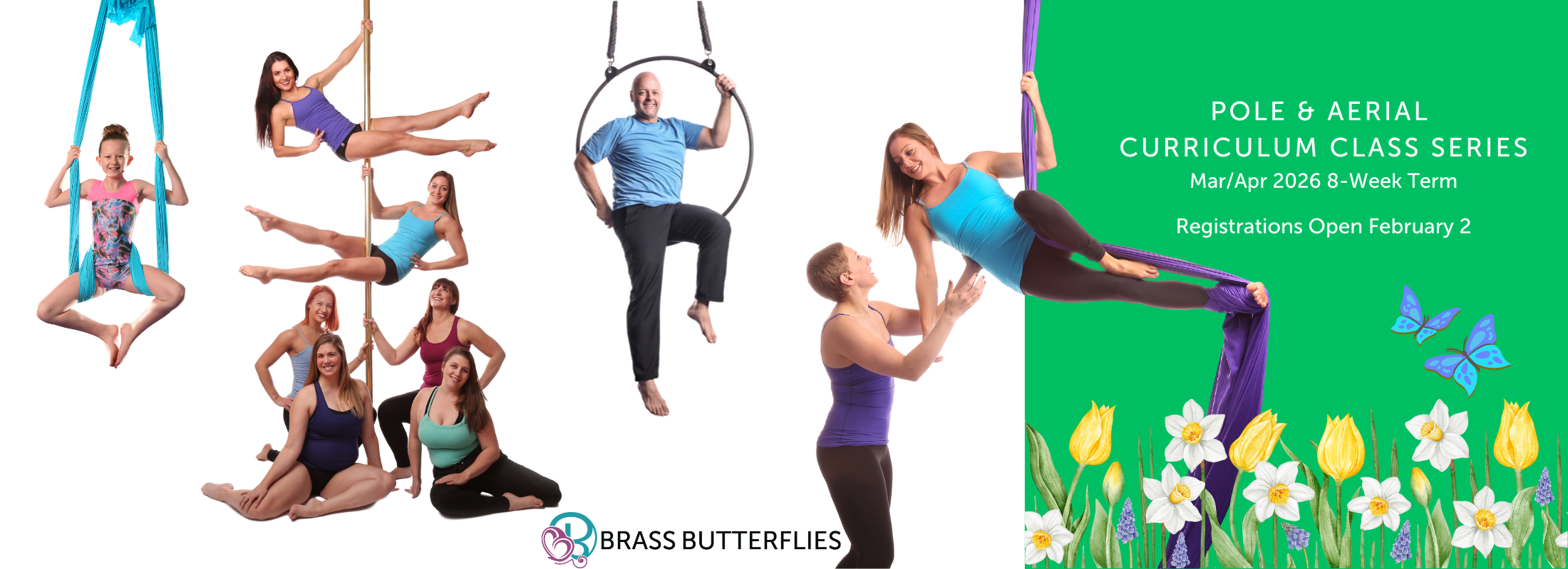 Brass Butterflies offers group pole dancing and aerial arts classes in progressive, levelled curriculums, with material to challenge everyone from the absolute beginner to the elite performer or athlete. The skills in each level are taught with a focus on developing foundational movement patterns and strength, then building on these foundations in a safe and progressive manner that allows students to work at their own pace in a supportive and non-judgmental atmosphere. Students will progress through the levels as they are able to demonstrate the foundational skills in each level and are given the go ahead to move on from their instructors. Our curriculum classes are taught in 8 week Terms where students are registered in and expected to attend all weekly classes in a series, usually at the same time each week. Though we offer supplemental stand alone clinics and workshops, committing to a consistent weekly routine is the most effective way to see progress.